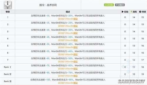指令:战术协同——使用该技能后,自身攻击速度将增加60/70/80/100,同时将Mon3tr的攻击力提升50%/60%/75%/90%。此外,Mon3tr可攻击阻挡的所有敌人。需要注意的是,该技能只能和Mon3tr搭配使用。