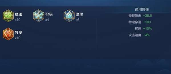 3、第一套铭文:10异变、6隐匿+4狩猎、10鹰眼