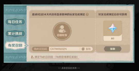另外,邀请玩家回归,完成有奖召回,可额外获得80原石奖励。