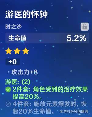 关于圣遗物方面,一些可以通过冒险手册的见闻获得。这里有一套四星的少女套装,获得后不需要关注属性,直接佩戴即可。如果主属性是生命值和治疗加成,直接进行强化,尽可能升级到更高级别。这些圣遗物后期都只是用来当狗粮,或者如果你技巧很高,不加强也没关系,它只需要提供少量治疗。这样还能省下资源。