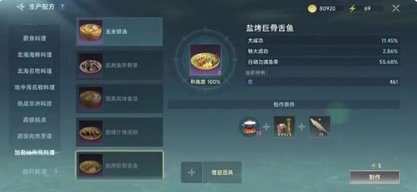 不是很推荐选择巨骨舌鱼,因为他的钓点离枢纽港有些远,不方便存很多吃+5烹饪道具一起搓,而且材料需要3个香草盐增加了制作成本。