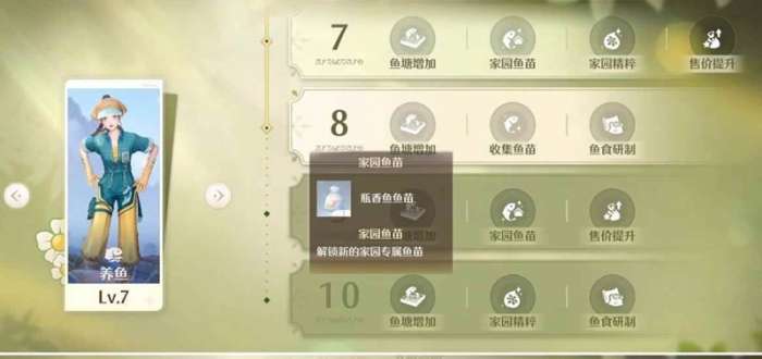 3.升级养鱼9,即59696。养鱼8级开始收集紫色鱼苗,钓纱裙鱼苗,然后刷熟练度拿12kg的成就。养鱼9级解锁瓶香鱼,然后就有材料给蓝色动物做头饰了,做完还能再染色做成就。