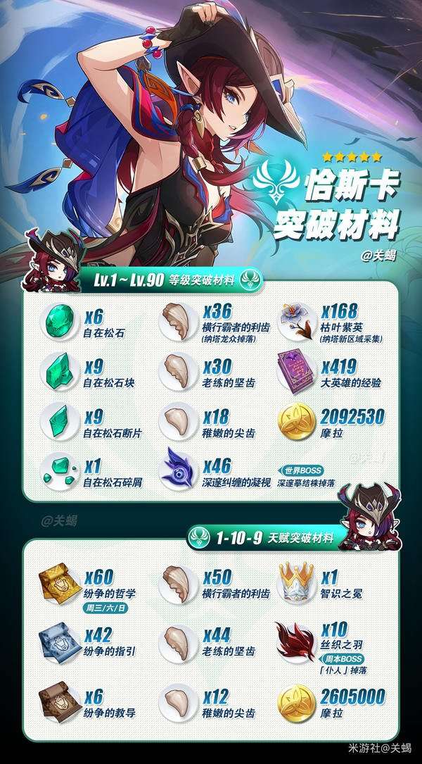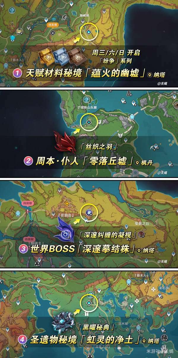 包含角色等级「lv.1~lv.90」和天赋等级「1-10-9」所需要的突破材料清单;天赋、周本、各BOSS、圣遗物等材料秘境挑战位置,以及采摘收集类材料位置路线图。