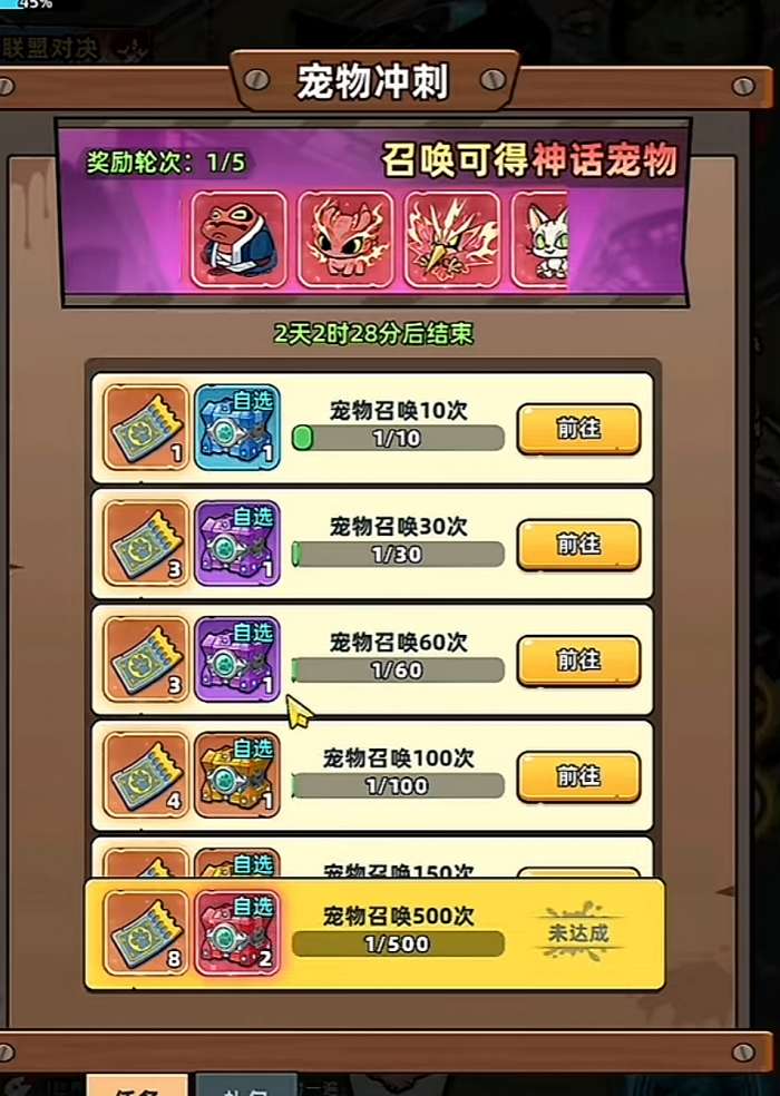 目前游戏里的宠物活动一共有三个,宠物冲刺,宠物转盘以及宠物探险。宠物冲刺是在生存的第14天开始的,一共分为5轮奖励,完成每轮冲刺任务之后就会获得对应的奖励宝箱,最终是神话宠物任选箱,达到这个奖励的任务条件是完成宠物召唤次数300或者是400以及500,唯一的区别就是500的话奖励宝箱是神话宠物5选2,其他两个只能选择1只。如果你已经达到500次的条件,那么大概率是宠物全图鉴了,所以大家如果是实在抽不出神话级宠物,就可以选择300档位的奖励,也是可以的。