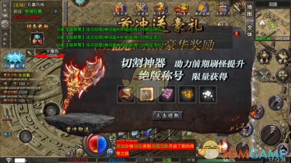 3、还有首充礼包,首充即可获得豪华奖励,切割神器助力你前期刷怪提升,还有绝版称号;