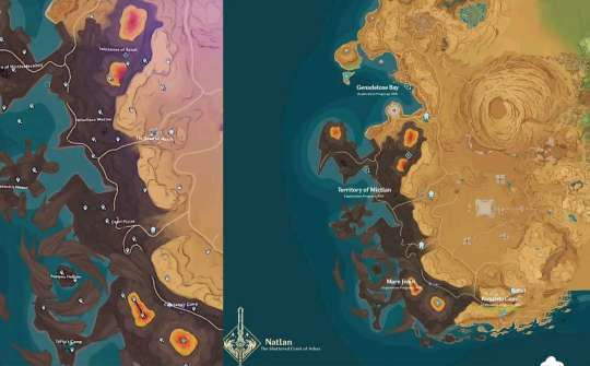 我们可以仔细看一下地图信息,位置在须弥的左侧,靠近大海。按照原本得知的地貌设计,纳塔的版图会很大,不会只占须弥的边缘部分。纳塔也会分成地上与地下的设计,地下将会有熔岩区域,与其他地图的风景有很大的不同。