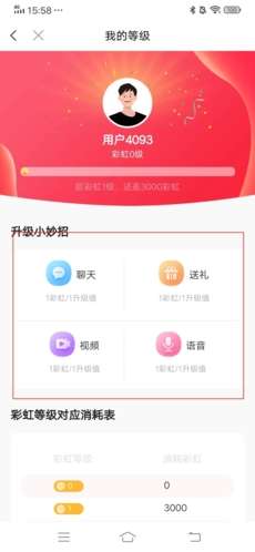 2、在这里我们就能看到当前账号的等级以及经验情况了,用户可以通过聊天、送礼、视频以及语音去花费彩虹来获取经验,达到一定数量时就能升级了。
