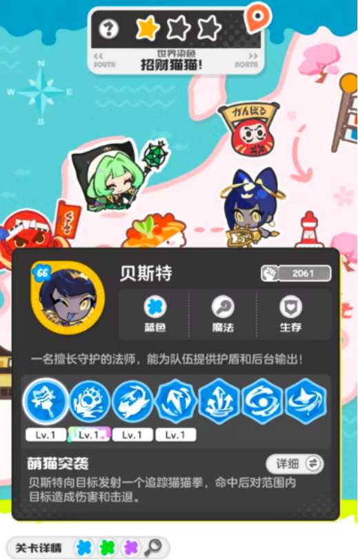 其中贝斯特作为蓝色系角色向目标发射追踪猫猫拳,当命中之后,对范围内目标造成较高的伤害以及击退,这属于魔法定位,是守护全员的法师,能够为全员队伍提供相当出色的护盾和后台输出,全程有护盾覆盖的加持,能够全方位降低队伍的承伤,在移动的过程当中可以借助地图快速移动标志调整位置,成为整个队伍当中的后台保障。法师狄安娜大招具有治疗作用,切换之后即可快速回血,当大招结束,快速点击其他的神明头像,就能够让全队回血,挑战招财猫猫这个boss时,此角色是不容错过的。