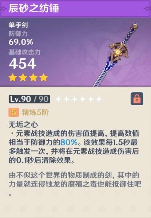这把武器是阿贝多量身定制的单手剑之一,它的唯二副属性是防御力,另外一把是旅行剑。此单手剑可以根据防御力提高E技能的伤害,单论E技能的后台伤害,它已超越了五星单手剑的存在。不幸的是,这把武器是活动武器,目前没有被复刻的先例,而且未来也很难说,希望有机会获取到吧。
