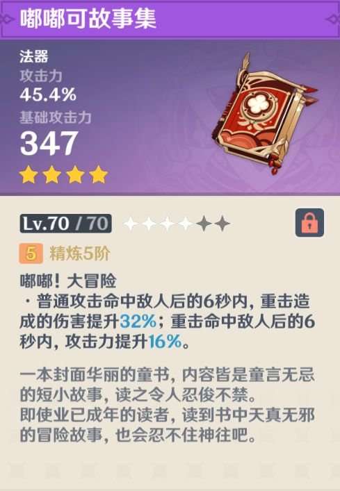这件物品的价值不在于它有多强,而在于它与可莉的外观和背景故事的相配合,终极外观毕业武器。此外,嘟嘟可的属性是,普通攻击命中敌人后能提升重击伤害,重击命中敌人后能提升攻击力,真的非常适合可莉使用。那些在1.6版本之后开始玩的可莉玩家,一定会非常有这把武器的玩家。