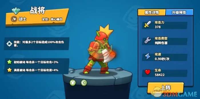 上榜理由:战将是强力输出搭配,在击杀目标后叠加攻速和伤害,前期养成系英雄,后期伤害大爆发将会造成范围性的高额伤害,可快速消灭敌人!