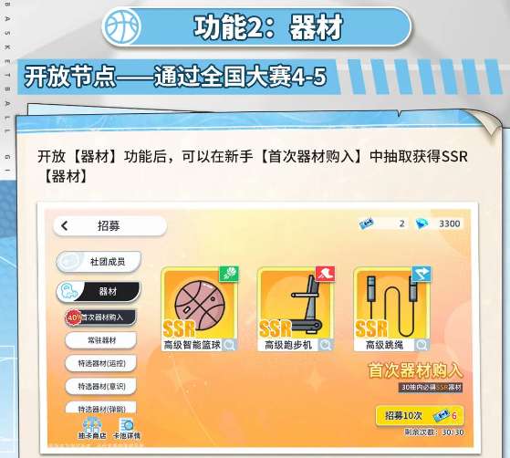 开放【器材】功能后,可以在新手【首次器材购入】中抽取获得SSR【器材】