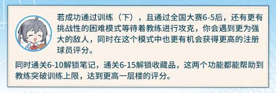 同时通关6-10解锁笔记,通关6-15解锁收藏品,这两个功能都能帮助到教练突破训练上限,达到更高一层楼的评分。