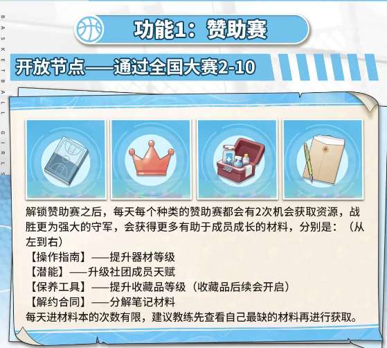 解锁赞助赛之后,每天每个种类的赞助赛都会有2次机会获取资源,战胜更为强大的守军,会获得更多有助于成员成长的材料,分别是:(从左到右)