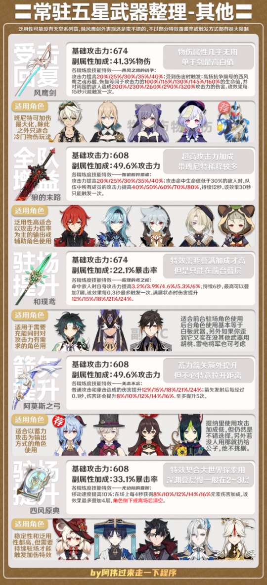这些武器都具有高度的泛用性,图中最多列出了五位适用角色。如果您发现图中有错误或对注释有更好的建议,请告知我,我会统一进行修改。