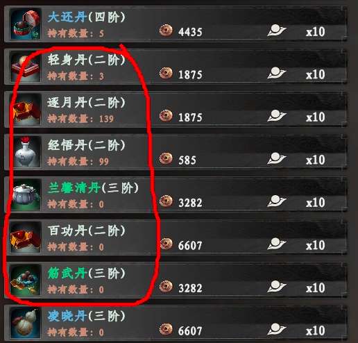 还可以前往小石镇丹师处进行丹药购买,但是的位点在(724,767),小编在图中圈出的这些丹药都可以进行感悟值的提升,不过需要玩家注意,小时镇附近会有一些怪兽想在这里刷感悟的话,建议将修为和感悟都提升到200万再进入,非常适合中后期的玩家们进行尝试。