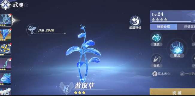 今天就以蓝银草武魂举例说明,玩家可以利用主线任务去推进,例如可以通过体力派送的福利快速的提升等级,在提升等级之后就可以解锁一些基础性的技能。