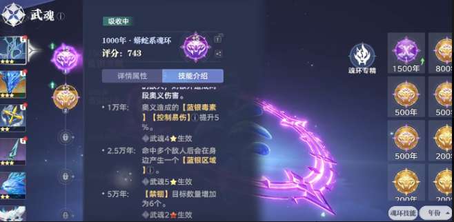 玩家的武魂等级在提升到24级时,就需要注重于魂环的升级,优先选择高年份的循环,例如1000年的蟒蛇系魂环,可以有效强化奥义伤害,同时也能够符合武魂的控制定位。一旦在选择装配之后,那自然就可以拉高整体的评分。