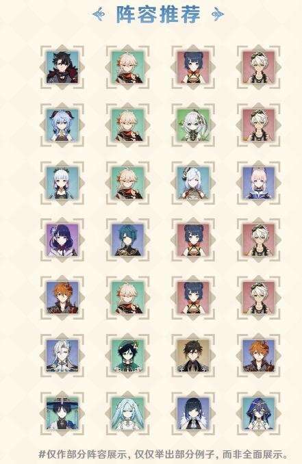 根据增益效果,我们较为推荐冰伤队、反应队以及主要伤害类型为普通攻击的队伍。如果你需要组建一支队伍,可以参考下图中的推荐阵容。