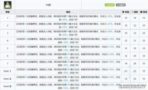 五、专精收益:一技能“半醒”没有质变阶段,在专精中也不增加回费,但每一级都在提高周转。唯一有小幅改变的是,专一增加了1%的每秒眠兽回血量。从七级到专三的DPS变化分别为7.6%、15.1%和32.9%,提升还算不错。建议的练度是七级(推荐)和专一(可考虑)。