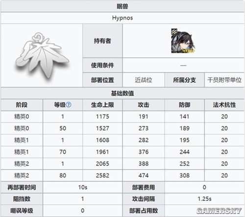 夜半有一项天赋叫做“夜行”,可以召唤出一种叫做眠兽的生物来协助战斗,类似于豆苗的专业饲养员。眠兽的属性随着夜半的练习而逐渐成长,就像召唤系干员一样。综合属性面板如下: