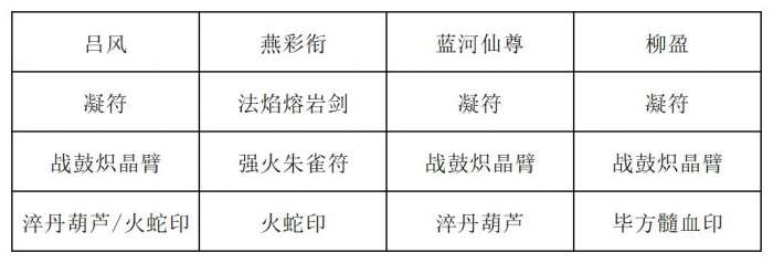柳盈打出玄冰神破、玄冰九变和化刃符(3),吕风复制化刃符并打出(1),燕彩珩打出焚元蓄威术(2),蓝河仙尊打出化刃符和无相凝水决,燕彩珩打出焚元蓄力决和战意决。