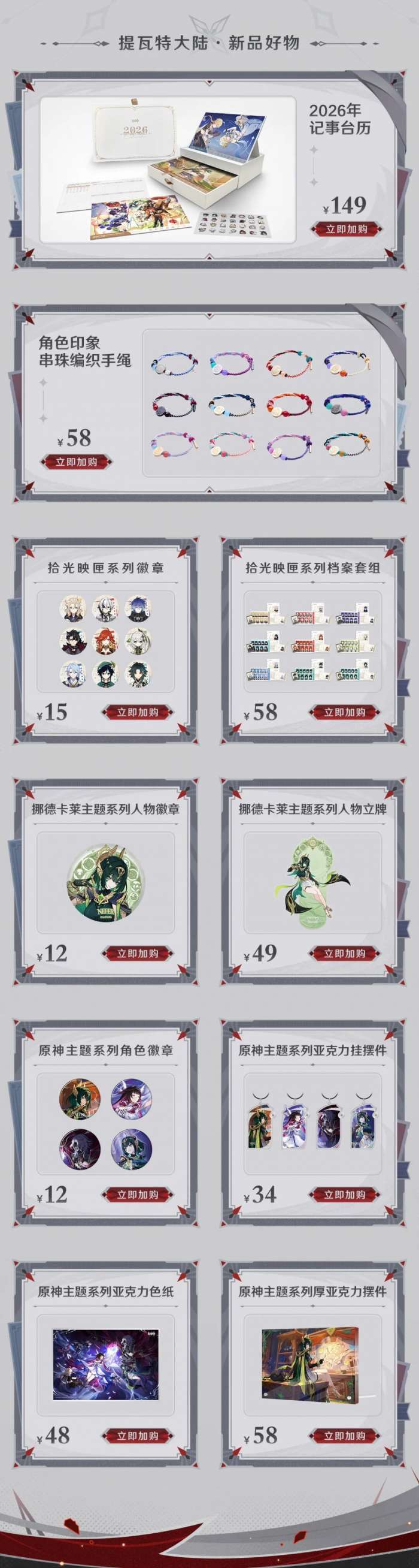「原神主题系列」推出新款徽章、摆件及亚克力色纸,喜欢「月之二」版本宣传图的旅行者可以选购啦。