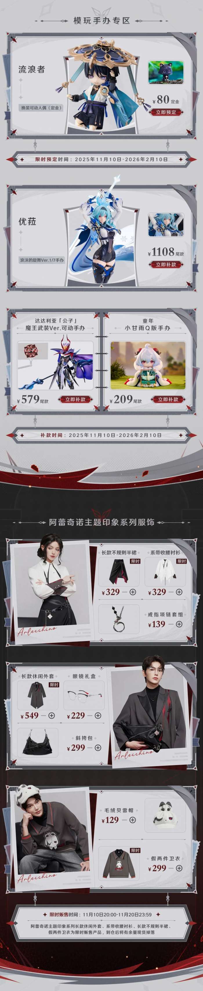「阿蕾奇诺」主题印象周边多款新品首发,包含:长款休闲外套、系带收腰衬衫、长款不规则半裙、假两件卫衣、多功能斜挎包、毛绒贝雷帽、眼镜礼盒、戒指项链套组。该系列部分商品将在2025年11月10日20:00至2025年11月20日23:59期间限时贩售,喜欢的旅行者不要错过哦。