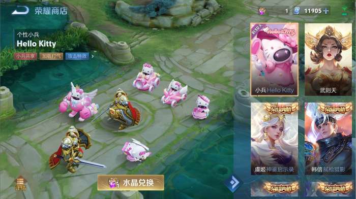 此次HelloKitty小兵皮肤为荣耀商店限时水晶兑换,只需要1水晶就可以拥有这次的联动小兵。