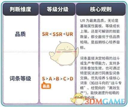 品质分为SR,SSR,UR。词条也有等级,划分为S最高,帕萌可同时拥有多个词条也可以同类型交换词条。