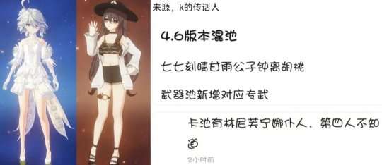 根据舅舅们爆料的最新消息来看,4.6版本依旧会有混池开放,也就是4.5之后的第二期混池,在4.6的混池中角色分别是:七七、刻晴、甘雨、公子、钟离、胡桃,武器池新增的则是对应角色的专武。