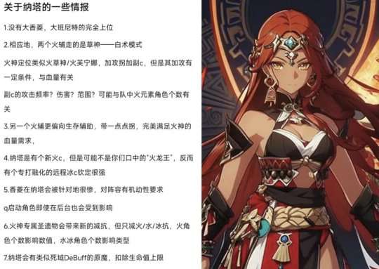 除此之外,后续纳塔的相关消息也被放了出来,废话不多说,具体大家直接看下图哈,简单来说就是,在后续没有大香菱、大班尼特的完全上位角色,两个火辅走的是草神、白术模式,火神的定位类似于草神/芙宁娜,加攻拐加副C,另一个火C更倾向于生存辅助,自身带点拐力,纳塔的新火C也大概率不是火龙王,至于香菱的话,在纳塔据说会被针对,当然啦,版本跨度大,保不保真就不知道了,大家还需理性观看哈!
