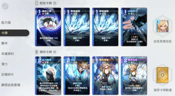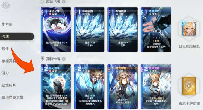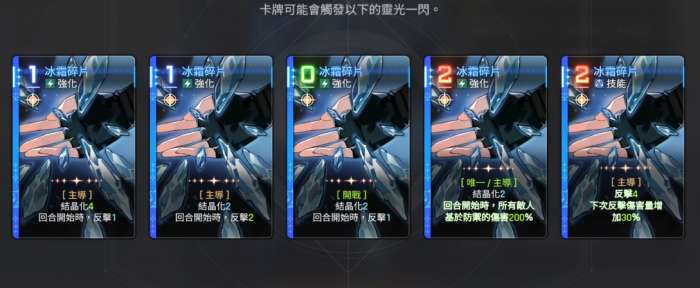 这里灵光一闪分为三种不同的类型,第一个是基础闪,这个基础闪就是你的任意卡闪了之后,把卡打出去,大家会获得一张新的卡,至于给什么卡是随机的,但随机的池子,取决于这个角色本身拥有什么卡,那么这里每一次刚进卡厄思的时候,每一个角色都只带了骑士卡牌的4张卡,比如说玛格纳,还有冻结之拳两张寒霜盾牌和冰霜碎片,下面的4张是靠闪给大家闪出来的,接着是第二种闪,那第二种闪就是强化闪,强化闪就会强化目前大家打出这张牌,它会从5个变体里面抽3个让大家选一个。
