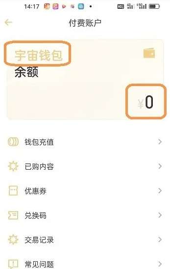 切换到付费账户页面以后,在【宇宙钱包】查看账户余额。