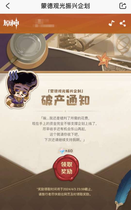 接着是米游社内的小活动。立本给大家送40原石,进入链接直接就能领取,连小游戏都没有,直接发到游戏内邮箱。不亏是立本好兄弟。