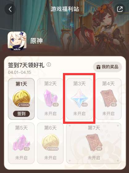 进入之后是游戏福利站,累计签到3天即可获得80原石兑换码。