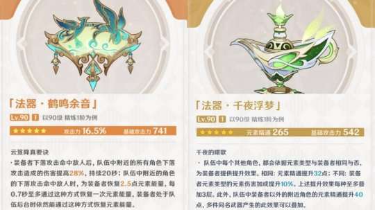 【5星武器】鹤鸣余音,仅推荐闲云玩家抽取,属性确实离谱但与其他角色搭配相性一般,除非可以跨越类型装备;千夜浮梦,主推纳西妲,其次八重神子、丽莎、烟绯、可莉之类打反应的法器角色可用。