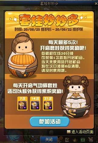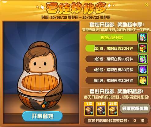 套娃活动将会在8月25日到9月22日期间开启,所有玩家都可以参与没有任何门槛,每一位玩家可以开启5次,并且以账号绑定的形式开启,也就是说不论你用几个号也只能开启5次。玩家没累积在线30分钟将会获得1次套娃机会,总计需要150分钟,也就是2个小时零30分钟。如果玩家当日不使用次数,则会在第二天清零,请玩家务必使用完次数。