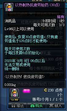 活动的疲劳值将于25日更新后上架,且为限定版,疲劳药剂为30点,每个账号只能购买一次,且售价为230点券,是否只能用点券购买暂时未知。不妨先留着点代币券,不能买的话再做考虑。不过小梦认为大概率是用点券购买的。