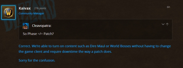 Kaivax表示,怀旧服的第一个补丁将会在今年晚些时候上线,钥匙链将会随着该补丁一同加入。同时他表示,阶段(Phase)和补丁(Patch)并不是一一对应的。暴雪可以在不改动游戏客户端的情况下开放厄运之槌或者世界Boss,但补丁的上线需要服务器停机,Kaivax也对这一情况引起玩家迷惑表达了歉意。