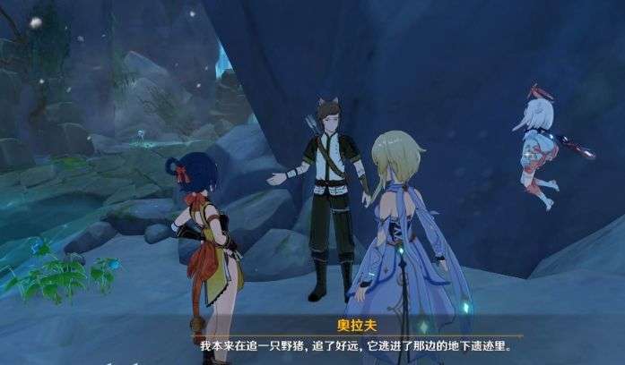 2、找到一名瑟瑟发抖的人,得知这位名为奥拉夫的猎人受到了冰史莱姆的攻击;