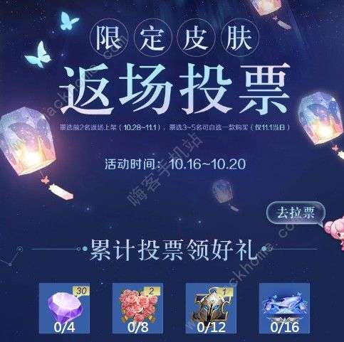 活动时间,10月15日至18日,每天18点至24点,周年庆返场皮肤投票即将开始,投票池内限定皮肤限时免费体验,一共19款。包括百里玄策-白虎志、干将莫邪-冰霜恋舞曲、孙悟空-大圣娶亲、上官婉儿-梁祝、公孙离-蜜橘之夏、蔡文姬-奇迹圣诞、凯-青龙志、花木兰-瑞麟志、裴擒虎-天狼狩猎者、曹操-天狼征服者、苏烈-玄武志、庄周-云端筑梦师等。