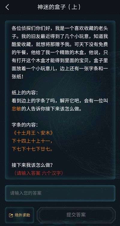 各位侦探们你们好,我是一个喜欢收藏的老头子。我的旧友最近得到了几个小玩意,知道我酷爱收藏,就想将那赠予我。可天下没有免费的午餐,他给了我一个精致的木盒,他说,只有打开这个木盒才能得到里面的宝贝,盒子里面放着一个小玩意儿,边上还有一张字条和一张纸!