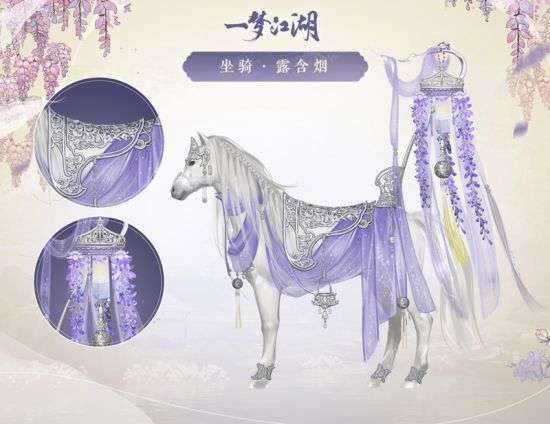 云锦楼的大师傅根据仇雪珮的手稿全新制作的坐骑,将紫藤和白马相结合,推出了“坐骑·露含烟”。马身披以紫纱,马背支以紫藤,相信会是少侠们的心头好了!