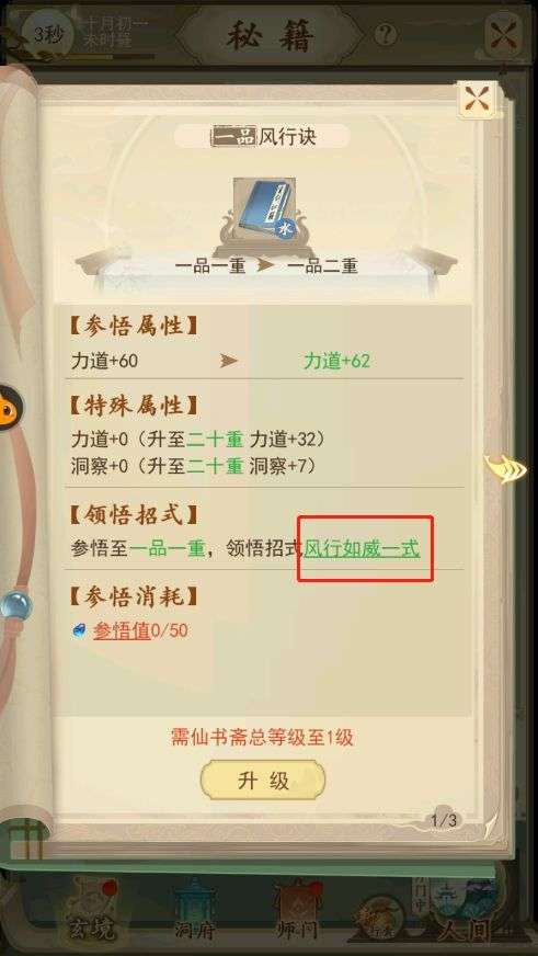 1. 功法的等级上线是需要由洞府里面仙书斋的等级高低决定的。