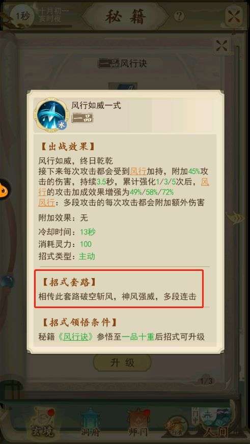 招式详解:这个跟前面说第一页点进去的功法介绍差不多(带颜色的字可以多点点,有说明的,比如点风行你会看到具体的描述)