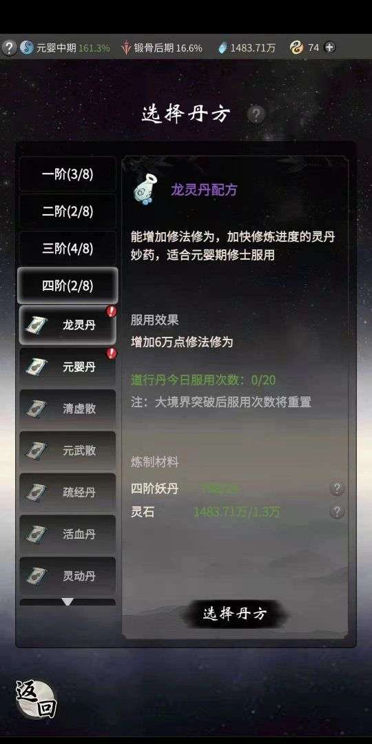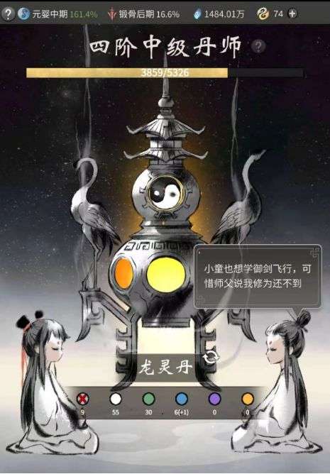 炼制仙丹,自古以来就是求仙问道的常规方式,《一念逍遥》亦是如此。在洞府的丹房界面,我们可选择配方,消耗相应的材料,炼制出不同品阶、不同功效的丹药。游戏中,丹药根据修为提高有不同的等阶,每阶各有8种,配方主要是从城镇-坊市和宗门-藏经阁购买,具体丹药有: