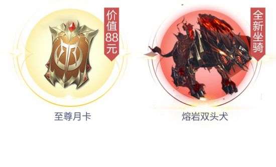公测期间,游戏内付费达到相应标准可以免费领取至尊月卡以及全新坐骑熔岩双头犬,让你能随时随地享受到其他玩家的注目礼!