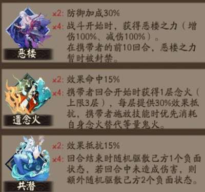 四件套:携带者回合开始时获得1层念火(上限3层),每层提供30%效果抵抗,携带者施放技能时优先消耗自身念火替代等量鬼火。