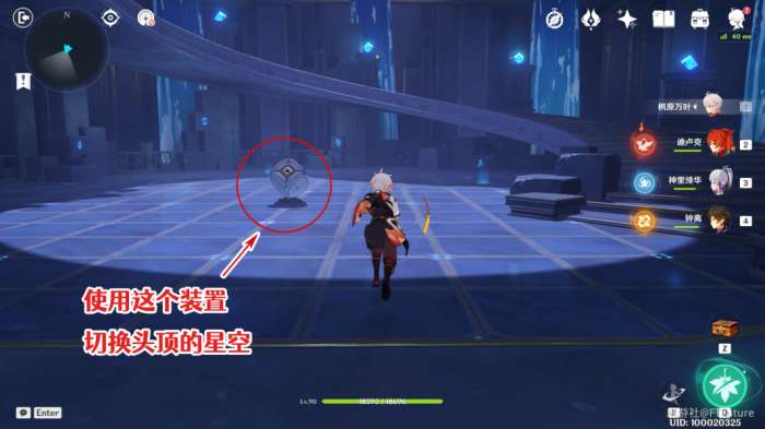 进入通道2中,一路往里走,走到螺旋阶梯房间,可以看到场地中央中央有1个装置,他可以用来切换我们头顶的星空图案。